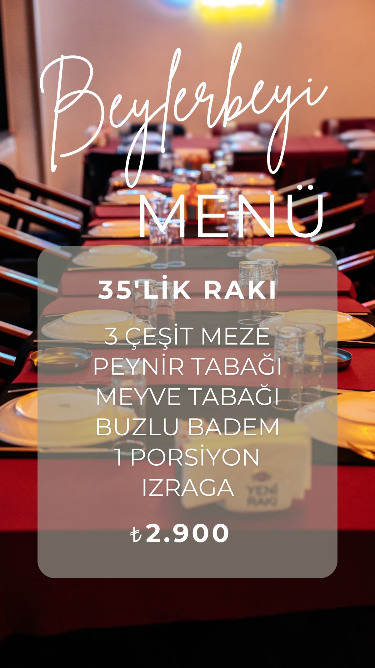 35’lik beylerbeyi rakı ile 3 çeşit meze, peynir tabağı, meyve tabağı, buzlu badem 1 porsiyon ızgara