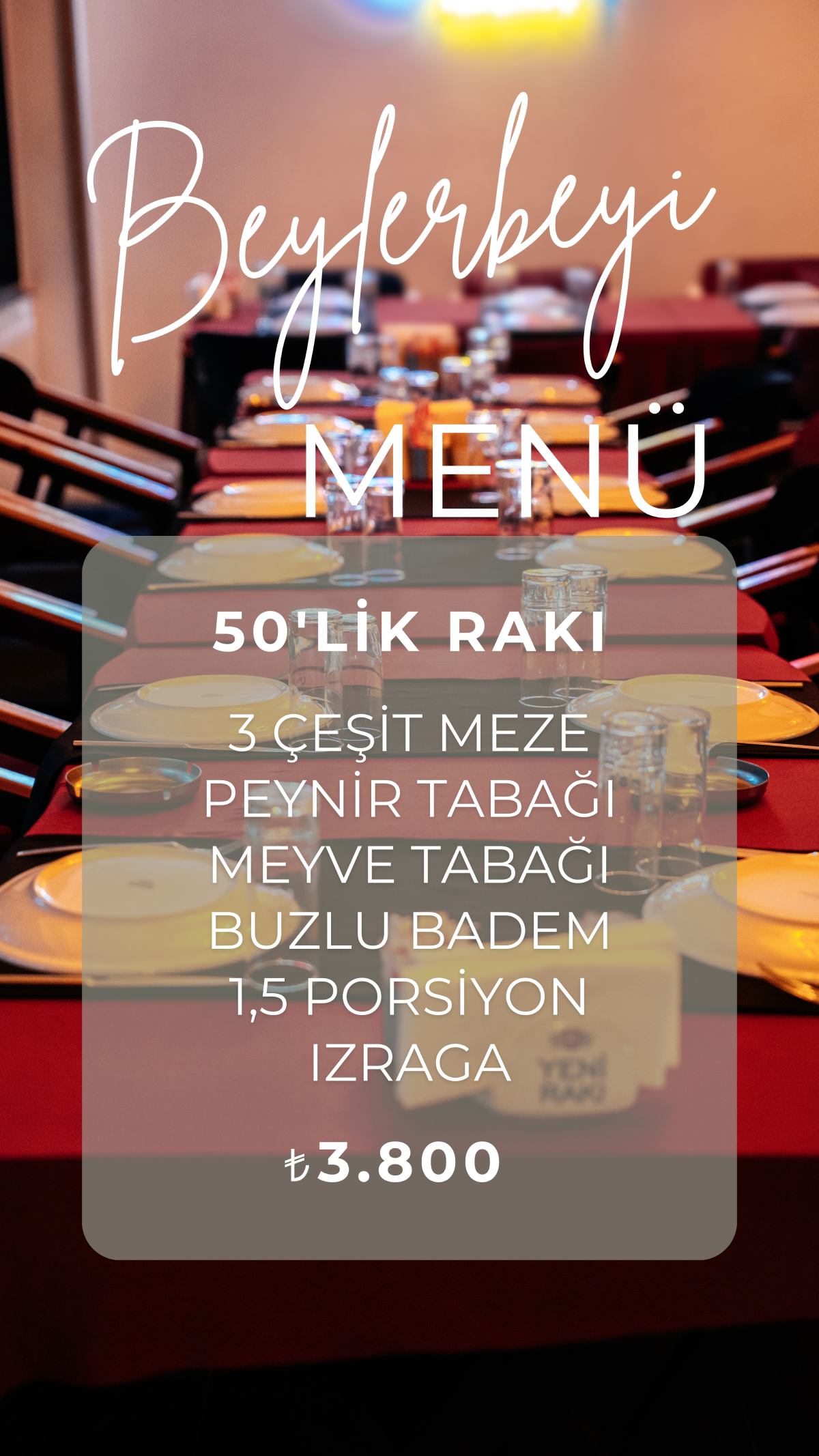 100’lük beylerbeyi rakı ile 5 çeşit meze, peynir tabağı, meyve tabağı, buzlu badem 2 porsiyon ızgara